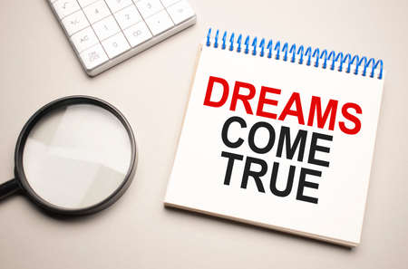 Business and finance concept. On the table is a magnifying glass, a calculator and a notebook with the inscription - Dreams Come True