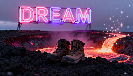 Worn boots sit on cooled volcanic rock beside a glowing lava flow beneath a neon DREAM sign with smoke and sparkles in the dusk sky. There is available space for text in the upper sky area to add copy or branding elements