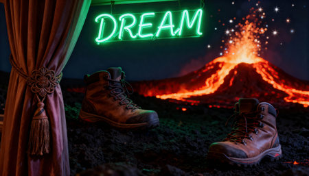 Dream neon sign glows above hiking boots on lava rock beside an erupting volcano at night, with molten lava and starry sky, a curtain drape frames the scene, and a dark area provides clear space for text or design elements