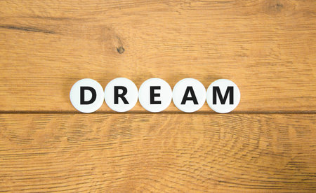 Dream symbol. Concept word Dream on beautiful white pills circles. Beautiful wooden table wooden background. Business lifestyle dream concept. Copy space.