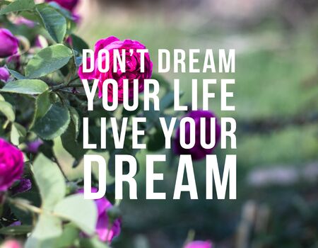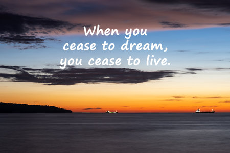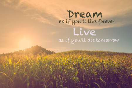 Inspiration quote (Dream as if you’ll live forever , Live as if you’ll die tomorrow) on vintage photo of mountain at sunset
