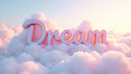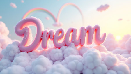 DREAM in 3D cursive font made of fluffy clouds and rainbows set in a pastel sky at sunset