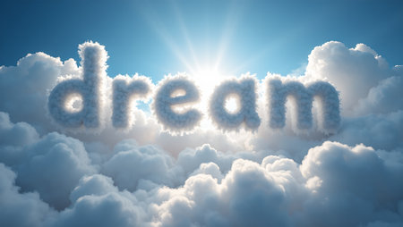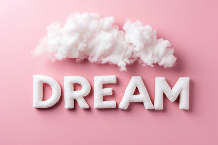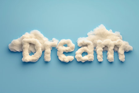 A thought-provoking image tailor-made for motivational content, mindset coaching, or inspirational design projects | This creative photograph features the word DREAM constructed from plump cotton-like material that resembles fluffy clouds against a soothing blue background, invoking a dreamy, ethereal atmosphere. The textured appearance of the cloud-like forms gives a tangible quality to the intangible concept of dreams, suggesting that aspirations and thoughts have weight and presence. Each letter is meticulously crafted to appear soft and inviting, encouraging viewers to connect with their own aspirations and the boundlessness of imagination. The blue backdrop serves as a metaphor for a clear sky, which often symbolizes limitless potential and the expansion of possibilities. The composition is simple yet powerful, with the stark contrast between the white 'clouds' and the blue backdrop amplifying the message of clarity and focus required to realize one's dreams. Soft, diffused lighting enhances the overall serene mood, inviting contemplation | Perfect for use in articles about personal growth, as visual metaphors in psychological literature, or as a serene addition to a workspace to invoke calm and inspiration. This image could also enhance educational materials about creative thinking or be featured in advertisements for services related to self-improvement and lifestyle coaching | a conceptual photo of the word DREAM formed with cloud-like material set against a blue background, which uses contrast and texture to visually represent the themes of aspiration and creativity with potential applications in motivational and educational contexts