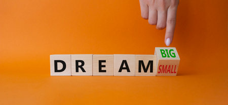 Dream Big vs Small symbol. Businessman Hand points at wooden cubes with words Dream Small and Dream Big. beautiful orange background. Business and dream concept. copy space