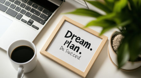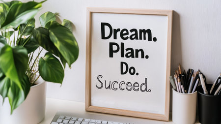 Desk setup with Dream. Plan. Do. Succeed. framed quote and office items, tidy and motivating