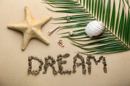 Dream, text written by hand in sand on a beach, with a soft wave.