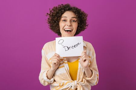 Portrait of an attractive dreamy young woman with curly brunette hair standing isolated over violet background, holding board with motivational lettering