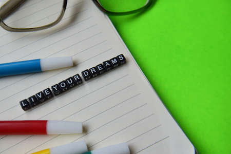 Live your dreams message written on wooden blocks. education and motivation concepts. Cross processed image on green Background