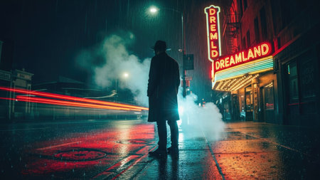 A silhouetted figure stands in front of a vintage theater marquee at night. The scene is illuminated by neon lights and vehicle streaks. Smoke adds a mysterious quality to the street environment. This image could be used for various media including advertising and editorial projects.