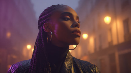 An evocative close-up of a woman with braided hair and large hoop earrings against a misty city backdrop. Streetlights glow through the haze.