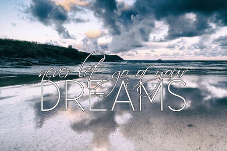 A serene scene featuring the word DREAM formed by letter blocks against a beautiful sunrise with clouds. This image captures hope, inspiration, and positivity.