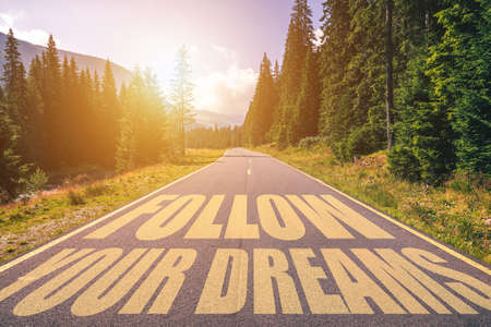 Follow your dreams text written on road in the mountains