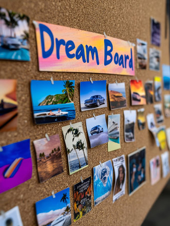 A dynamic dream board featuring a variety of colorful images, travel inspirations, and success-driven quotes, enhancing personal motivation and goal-setting efforts.