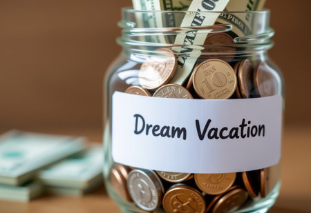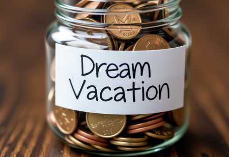 A glass jar filled with coins, labeled Dream Vacation, symbolizing saving for travel and achieving travel goals.