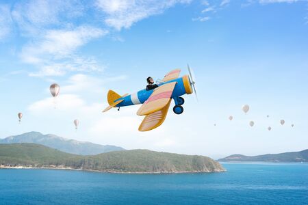 Woman in retro airplane . Mixed media