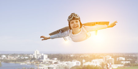 Happy little boy flying wearing helmet