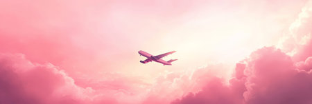Airplane gracefully gliding through the sky above pink clouds at sunset, evoking wanderlust and adventure for travelers seeking freedom and relaxation. Perfect for travel themes