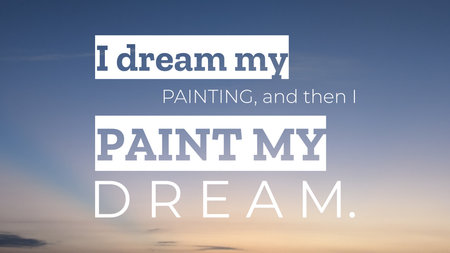 A creative image featuring the quote 'I dream my PAINTING and then I PAINT MY DREAM.' The bold text is set against a vibrant background of a clear blue sky transitioning to a golden hour.