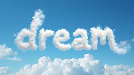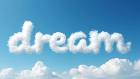 Whimsical dream spelled in fluffy cloud letters on blue sky