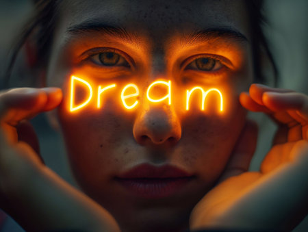 Dream, glowing letters in hand, light hitting face generative ai