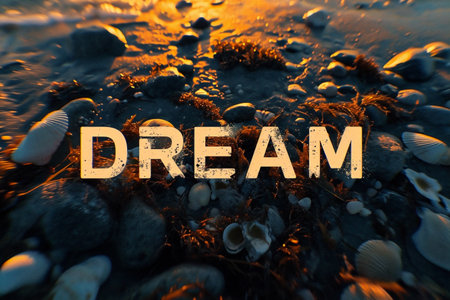 Dream word on the beach with seashells and pebbles