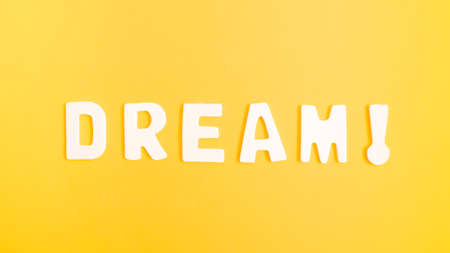Minimalistic flat lay concept with white isolated letters on vivid yellow background. Creative optimism, motivation and dream idea, modern aesthetic aesthetics.