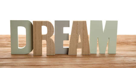Stylish decor in shape of word DREAM on table against white background
