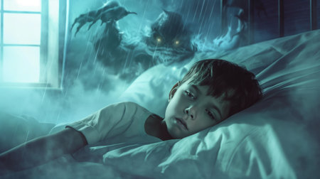 A little boy in bed at night is afraid of a monster. The concept of childhood fears and nightmares