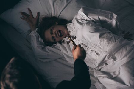 exorcist holding cross over demonic yelling girl in bed