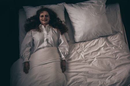 top view of creepy smiling demon in nightgown lying in bed