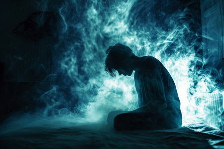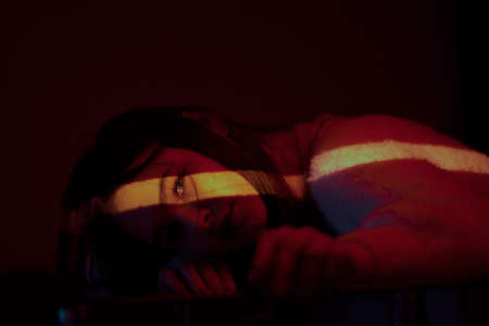Woman overwhelmed by anxiety sitting alone in a dark room