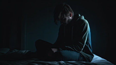 A youth lies in bed, gazing at the blank ceiling, their face reflecting emptiness and despair. The dimly lit room adds to their sense of isolation.