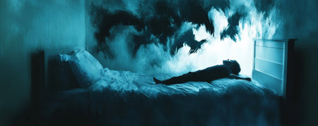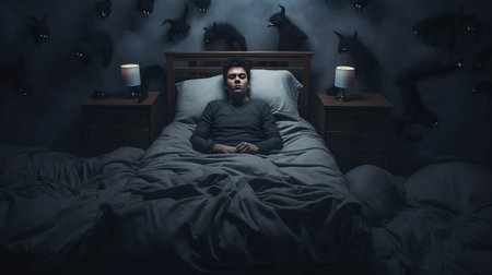 Sleepless Man Haunted By Nightmares Battles Demons In The Embrace Of Darkness. Concept Nightmares, Sleepless Man, Battling Demons, Embrace Of Darkness.