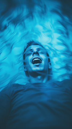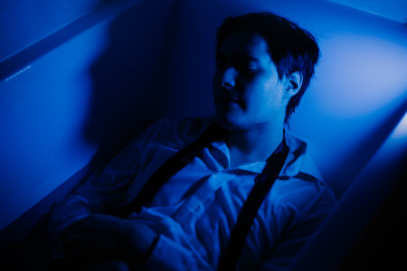 A young man in a dim blue light, melancholicly lying in a filled bathtub, wearing a wet shirt. The solitude, introspection, and emotional vulnerability.