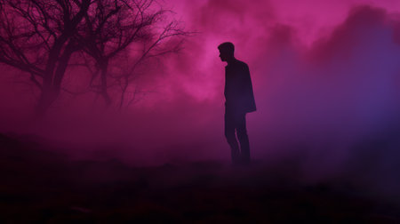 a dark man stands in the fog, his silhouette blending with the eerie landscape. in a vibrant and exaggerated style, this conceptual installation art features a second man. the monochromatic palette of violet and pink adds to the eerie atmosphere, creating a pop-culture-infused scene perfect for halloween. ai generated