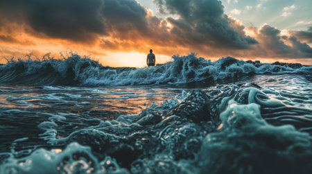 A man stands on the shore, facing powerful ocean waves crashing against the beach at sunrise under dramatic clouds.