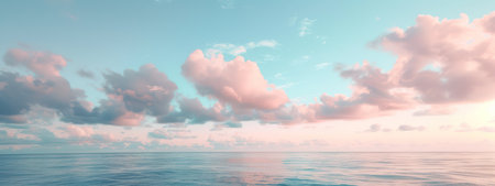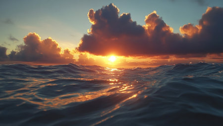Calm ocean scene featuring deep teal water and a picturesque sky filled with soft clouds illuminated by the setting sun. A tranquil and scenic nature background.