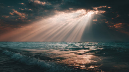 Breathtaking ocean view with sunlight streaming through dark clouds, creating serene atmosphere. gentle waves reflect light, enhancing tranquil beauty of seascape