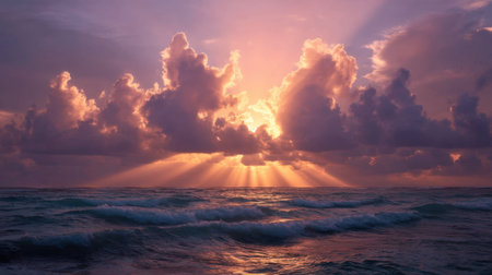 A breathtaking view of a sunset over a calm ocean, featuring vibrant clouds illuminated by sunbeams, creating a serene and tranquil atmosphere for nature lovers.