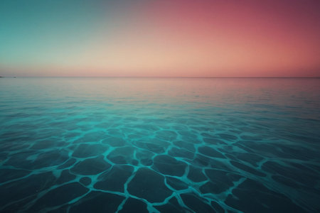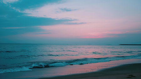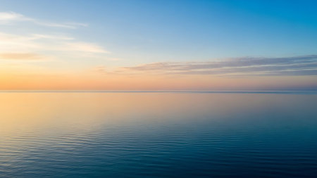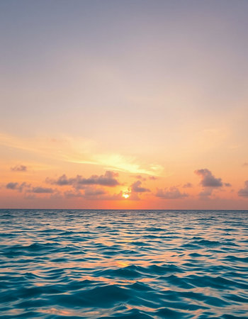 A tranquil ocean horizon at sunset a soft pastel sky and gentle ripples on the calm blue water, creating a serene atmosphere.