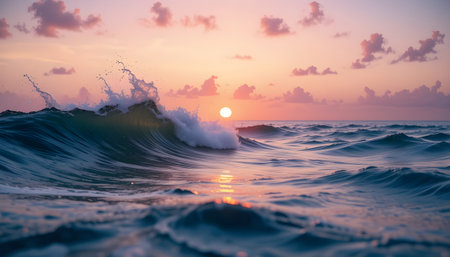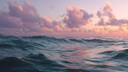 A breathtaking sunset view over gentle ocean waves, featuring a soft pink sky and wispy clouds, creating a tranquil atmosphere perfect for relaxation and nature lovers.