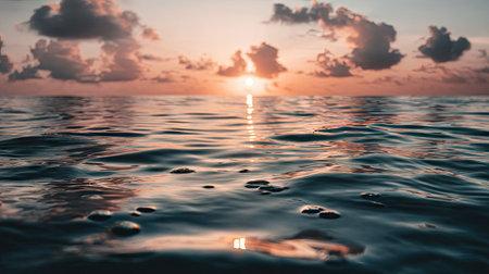 A tranquil seascape captured from the waters surface. The gentle waves of the turquoise sea reflect the warm, pastel colors of the sunset clouds in the sky.