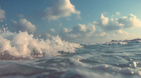 Calm ocean waves gently ripple under the warm sunlight, creating beautiful reflections on the water's surface near a picturesque shoreline. Perfect for summer vibes.