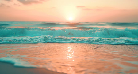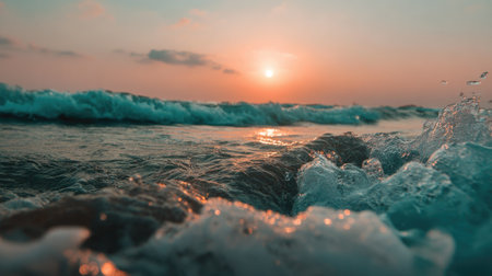 A close-up view of ocean waves crashing on the shore at sunset, creating a beautiful and serene scene.