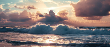 Experience the captivating beauty of ocean waves crashing gently at sunset. The dramatic clouds add depth and allure to this serene and tranquil seascape.