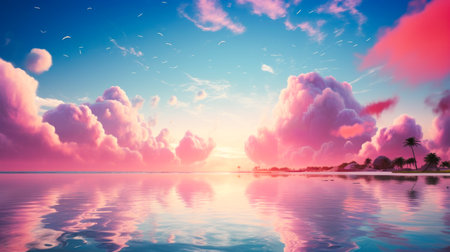 Waves gently ripple across the foreground as the sunset sky blazes with pink and blue hues above a distant shoreline.. AI Generation