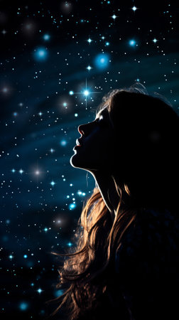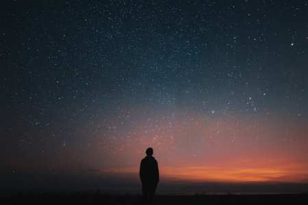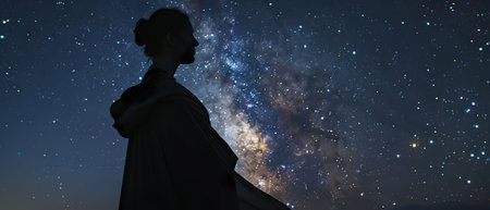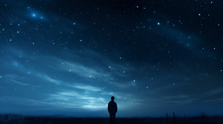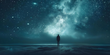 Concept photo of a person gazing up at a starry night sky, with the Milky Way galaxy stretching above them. The vastness of the universe and the persons small presence signify the grandeu