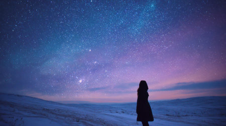 A person stands in a snowy landscape, gazing at a vibrant night sky adorned with countless stars and shades of purple and blue auroras during winter.