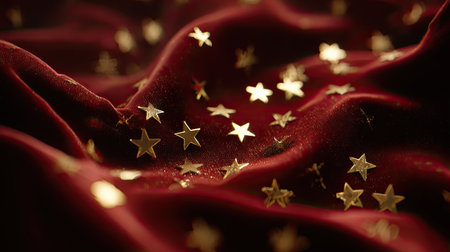 Close-up view of an elegant red fabric adorned with shimmering golden stars, perfect for festive celebrations and glamorous event decor. This rich textile captures a cozy and luxurious ambiance, making it suitable for various creative projects.