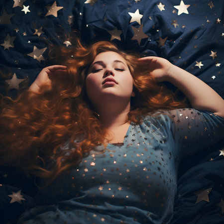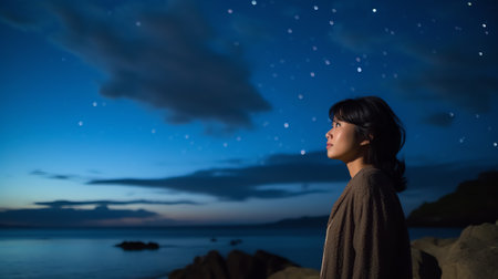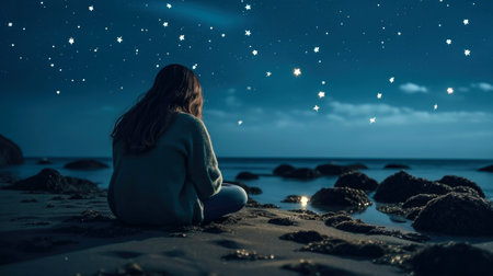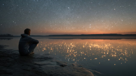 Concept photo of a person sitting on the shore of a still lake, their arms wrapped around their knees, watching the reflection of the stars and moon on the waters surface, lost in contemplatio